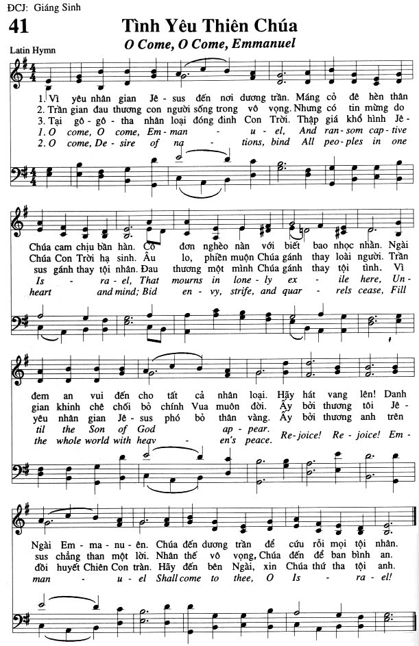 1. Vì yêu nhân gian Jê-sus đến nơi dương trần. Máng cỏ đê hèn thân Chúa cam chịu bần hàn. Cô đơn nghèo nàn với biết bao nhọc nhằn. Ngài đem an vui đến cho tất cả nhân loại. Hãy hát vang lên! Danh Ngài Em-ma-nu-ên. Chúa đến dương trần để cứu rỗi mọi tội nhân. 2. Trần gian đau thương con người sống trong vô vọng. Nhưng có tin mừng do Chúa Con Trời hạ sinh. Âu lo, phiền muộn Chúa gánh thay loài người. Trần gian khinh chê chối bỏ chính Vua muôn đời. Ây bởi thương tôi Jê-sus chẳng than một lời. Nhân thế vô vọng, Chúa đến để ban bình an. 3. Tại gô-gô-tha nhân loại đóng đinh Con Trời. Thập giá khổ hình Jê-sus gánh thay tội nhân. Đau thương một mình Chúa gánh thay tội tình. Vì yêu nhân gian Jê-sus phó bỏ thân vàng. Ây bởi thương anh trên đồi huyết Chiên Con tràn. Hãy đến bên Ngài, xin Chúa thứ tha tội anh.