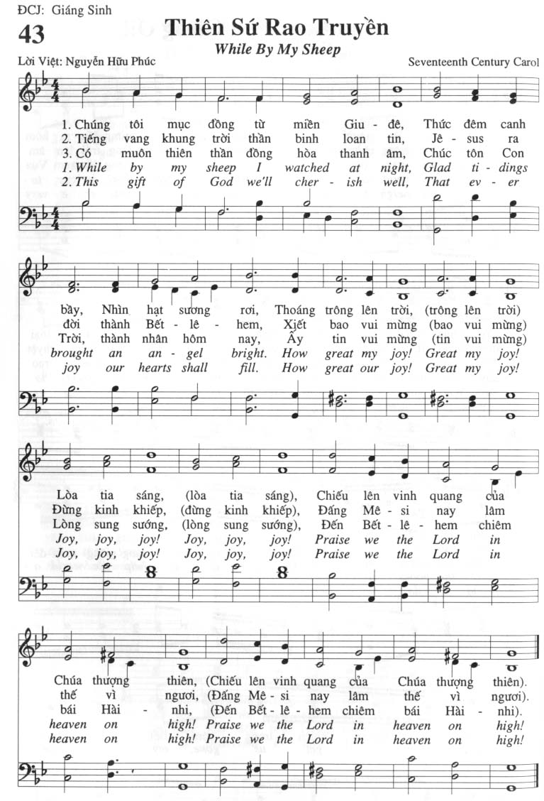 1. Chúng tôi mục đồng từ miền Giu-đê, Thức đêm canh bày, Nhìn hạt sương rơi, Thoáng trông lên trời, (trông lên trời) Lòa tia sáng, (lòa tia sáng), Chiếu lên vinh quang của Chúa thượng thiên, (Chiếu lên vinh quang của Chúa thượng thiên). 2. Tiếng vang khung trời thần binh loan tin, Je-sus ra đời thành Bết-lê-hem, Xiết bao vui mừng (bao vui mừng) Đừng kinh khiếp, (đừng kinh khiếp), Đấng Mê-si nay lâm thế vì người, (Đấng Mê-si nay lâm thế vì người). 3. Có muôn thiên thần đồng hòa thanh âm, Chúc tôn Con Trời, thành nhân hôm nay, Ấy tin vui mừng (tin vui mừng) Lòng sung sướng, (lòng sung sướng), Đến Bết-lê-hem chiêm bái Hài nhi, (Đến Bết-lê-hem chiêm bái Hài nhi).