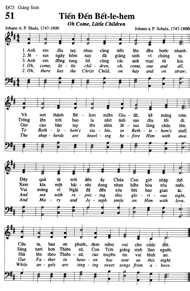 1. Anh em dìu tay nhau cùng tiến lên đều bước nhanh. Vô nơi thành Bê-lem miền Giu-đê, kẻ máng rơm. Đây quà từ trời đến ấy Chúa Con giờ nhập thế. Cứu ta, ban ơn phước, đem niềm vui cho cuộc đời. Oh, come, little children, oh, come, one and all, To Beth-le-hem's stable, in Beth-le-hem's stall, And see with rejoicing this glorious sight, Our Father in heaven has sent us this night. 2. Je-sus ngày hôm nay đà giáng sinh vì chúng ta. Trông lên trời bao la nhờ ánh sao dìu lối đi. Xem kìa một hài-nhi dung nhan hiền hòa trìu mến. Sáng tươi hơn Thiên sứ, Con Trời giáng sinh làm người. Oh, there lies the Christ Child, on hay and on straw; The shepherds are kneeling before Him with awe. And Ma-ry and Jo-seph smile on Him with love, While angels are singing sweet songs from above. 3. Anh em đồng tung hô cùng các anh mục tử kia. Giơ cao bàn tay lên nhìn Je-sus lòng chúc tôn. Vui mừng vì Ngài đã đến xóa bôi bao gian ác. Hát lên theo Thiên sứ, rao truyền tin vui bình an.