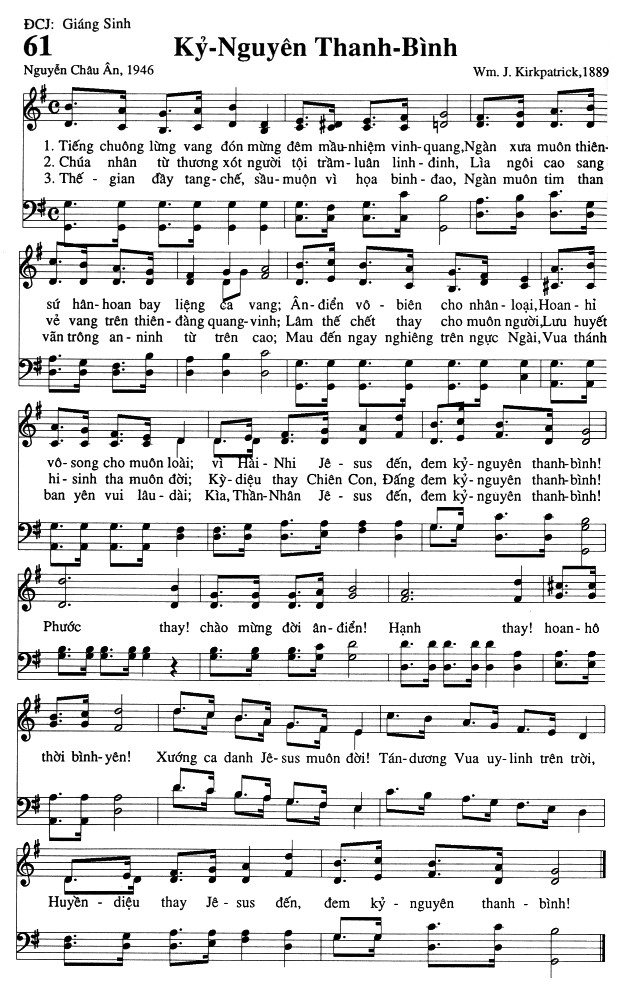 1. Tiếng chuông lừng vang đón mừng đêm mầu nhiệm vinh-quang, Ngàn xưa muôn thiên-sứ hân hoan bay liệng ca vang; Ân-điển vô biên cho nhân-loại, Hoan-hỉ vô-song cho muôn loài; 2. Chúa nhân từ thương xót người tội trầm luân linh dinh, Lìa ngôi cao sang vẻ vang trên thiên-đàng quang-vinh; Lâm thế chết thay cho muôn người, Lưu huyết hi-sinh tha muôn đời; 3. Thế gian đầy tang-chế, sầu muộn vì họa binh đao, Ngàn muôn tim than vẫn trông an-ninh từ trên cao; Mau đến ngay nghiêng trên ngực Ngài, Vua thánh ban yên vui lâu-dài; Điệp khúc: vì Hải-Nhi Jêsus đến, đem kỷ-nguyên thanh-bình! Kỳ-diệu thay Chiên Con, Đấng đem kỷ-nguyên thanh-bình! Kìa, Thần-Nhân Jêsus đến, đem kỷ-nguyên thanh-bình! Phước thay! chào mừng đời ân-điển! Hạnh thay! hoan-hô thời bình-yên! Xướng ca danh Jê-sus muôn đời! Tán-dương Vua uy-linh trên trời, Huyền diệu thay Jêsus đến, đem kỷ-nguyên thanh-bình!