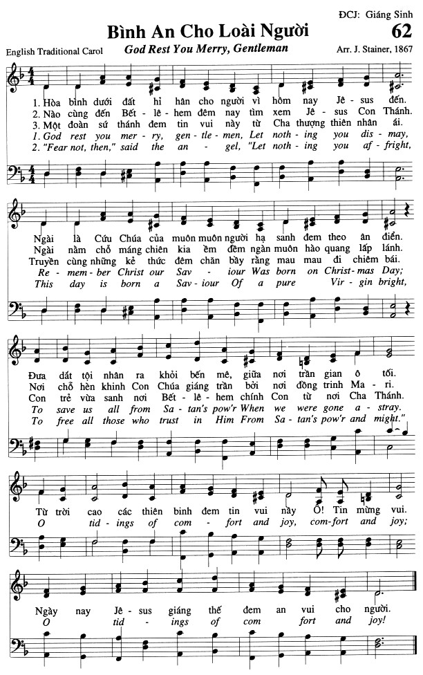 1. Hòa bình dưới đất hỉ hân cho người vì hôm nay Je-sus đến. Ngài là Cứu Chúa của muôn muôn người hạ sanh đem theo ân điển. Đưa dắt tôi nhân ra khỏi bến mê, giữa nơi trần gian ô tối. Từ trời cao các thiên binh đem tin vui này Ô! Tin mừng vui. Ngày nay Je-sus giáng thế đem an vui cho người. 2. Nào cùng đến Bết-lê-hem đêm nay tìm xem Je-sus Con Thánh. Ngài nằm chỗ máng chiên kia êm đềm ngàn muôn hào quang lấp lánh. Nơi chỗ hèn khinh Con Chúa giáng trần bởi nơi đồng trinh Ma-ri. O tidings of comfort and joy, comfort and joy; O tidings of comfort and joy! 3. Một đoàn sứ thánh đem tin vui này từ Cha thượng thiên nhân ái. Truyền cùng những kẻ thức đêm chăn bầy rằng mau mau đi chiêm bái. Con trẻ vừa sanh nơi Bết-lê-hem chính Con từ nơi Cha Thánh. O tidings of comfort and joy, comfort and joy; O tidings of comfort and joy!