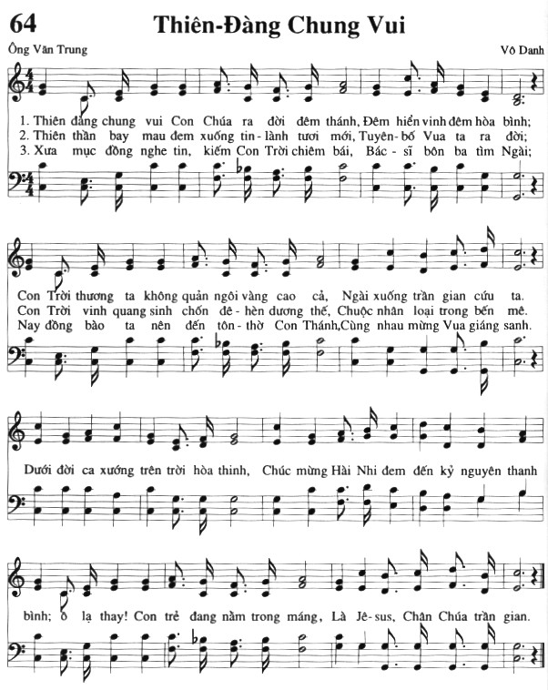 1. Thiên đàng chung vui Con Chúa ra đời đêm thánh, Đêm hiển vinh đêm hòa bình; Con Trời thương ta không quản ngôi vàng cao cả, Ngài xuống trần gian cứu ta. Dưới đời ca xướng trên trời hòa thinh, Chúc mừng Hài Nhi đem đến kỷ nguyên thanh bình; ồ lạ thay! Con trẻ đang nằm trong máng, Là Jê-sus, Chân Chúa trần gian. 2. Thiên thần bay mau đem xuống tin - lành tươi mới, Tuyên bố Vua ta ra đời; Con Trời vinh quang sinh chốn đê hèn dương thế, Chuộc nhân loại trong bến mê. Dưới đời ca xướng trên trời hòa thinh, Chúc mừng Hài Nhi đem đến kỷ nguyên thanh bình; ồ lạ thay! Con trẻ đang nằm trong máng, Là Jê-sus, Chân Chúa trần gian. 3. Xưa mục đồng nghe tin, kiếm Con Trời chiêm bái, Bác sĩ bôn ba tìm Ngài; Nay đồng bào ta nên đến tôn - thờ Con Thánh, Cùng nhau mừng Vua giáng sanh. Dưới đời ca xướng trên trời hòa thinh, Chúc mừng Hài Nhi đem đến kỷ nguyên thanh bình; ồ lạ thay! Con trẻ đang nằm trong máng, Là Jê-sus, Chân Chúa trần gian.