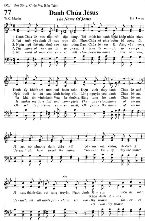 1. Danh Chúa Jê-sus thật rất dịu dàng, Tôi thích hát danh Ngài khắp nhân gian; Danh ấy khiến tôi tươi vui hoàn toàn, Diệu vinh thay danh Chúa Jê-sus! Jê-sus, có phương danh diệu kỳ! Jê-sus, thánh-dân vui tụng truyền, Ngợi danh Jê-sus thiên ức niên. 2. Tôi mến yêu danh Jê-sus trọn đời, Nhơn Chúa xẻ chia buồn - bã trong tôi; Ngài đuổi lo - âu xua kinh hoàng rồi, Lòng nguyện yêu danh Chúa Jê-sus. Jê-sus, mãi không di dịch gì! Khen danh Jê-sus. 3. Ngôn ngữ thế gian thuật sao tận tường, Danh Chúa Jê - sus là Đấng yêu thương, Ta khá tôn-vinh danh Vua lạ - thường; Hằng tung hô danh Chúa Jê-sus. Jê-sus, mãi không di dịch gì! Ngợi danh Jê-sus thiên ức niên.