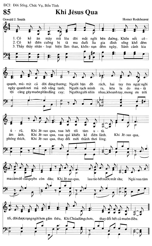 1. Có kẻ ăn mày mù lòa đôi mắt ngồi bên đường, Khốn nỗi cô quạnh, mù mịt cả đời đáng thương; Người bận đồ rách, hai tay ôm ngực ngồi ủ rũ, Khi Jê-sus qua, xua hết tối tăm u tù. Khi Jê-sus qua, macám dỗ oaiquyền còn đâu; Khi Jê-sus qua, lau ráo hết nước mắt sầu; Ngài xua tăm tối, đời được rạng ngời hơn gấm thêu, Khi Chúa dừng chơn, thay đổi hết cả muôn điều. 2. Có kẻ điên cuồng bị tà ma đuổi lìa gia đình sống khổ đêm ngày quanh nơi mả mồ vắng tanh; Người rạch mình ra, kêu la do ma tà ám ảnh, Khi Jê-sus qua, xua quỉ khiến kẻ điên lành. Khi Jê-sus qua, macám dỗ oaiquyền còn đâu; Khi Jê-sus qua, lau ráo hết nước mắt sầu; Ngài xua tăm tối, đời được rạng ngời hơn gấm thêu, Khi Chúa dừng chơn, thay đổi hết cả muôn điều. 3. Thảy thảy nhân loại hiện lầm than, khốn nạn đêm ngày, Sánh cảnh kia tội càng gây muôn phần đắng cay; Ngườingười nhìn nhau, khoanh tay, mong ơn trời phóng thích, Khi Jê-sus qua, thay đổi mới thảnh thơi lòng. Khi Jê-sus qua, macám dỗ oaiquyền còn đâu; Khi Jê-sus qua, lau ráo hết nước mắt sầu; Ngài xua tăm tối, đời được rạng ngời hơn gấm thêu, Khi Chúa dừng chơn, thay đổi hết cả muôn điều.