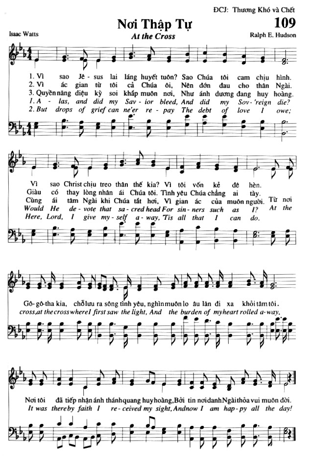 1. Vì sao Je-sus lại láng huyết tuôn? Sao Chúa tôi cam chịu hình. A-las, and did my Sav-ior bleed, And did my Sov-'reign die? 2. Vì ác gian từ tôi cả Chúa ôi, Nên đớn đau cho thân Ngài. But drops of grief can ne'er re-pay The debt of love I owe; 3. Quyền năng diệu kỳ soi khắp muôn nơi, Như ánh dương đang huy hoàng. Điệp khúc: Vì sao Christ chịu treo thân thế kia? Vì tôi vốn kẻ đê hèn. Giàu có thay lòng nhân ái Chúa tôi. Tình yêu Chúa chẳng ai tày. Cùng ái tâm Ngài khi Chúa tất hơi, Vì gian ác của muôn người. Từ nơi Would He de-vote that sa-cred head For sin-ners such as I? Here, Lord, I give my-self a-way, 'Tis all that I can do. Gô-gô-tha kia, chỗ lưu ra sông tình yêu, nghìn muôn lo âu lăn đi xa khỏi tâm tôi. cross, at the cross where I first saw the light, And the burden of my heart rolled a-way. Nơi tôi đã tiếp nhận ánh thánh quang huy hoàng, Bởi tin nơi danh Ngài thỏa vui muôn đời. It was thereby faith I re-ceived my sight, And now I am happy all the day!