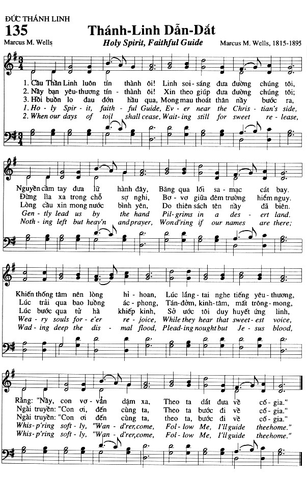 1. Cầu Thần Linh luôn tín thành ôi! Linh soi-sáng đưa đường chúng tôi, Nguyền cầm tay dưa lữ hành đây, Băng qua lối sa - mạc cát bay. Khiến thống tâm nên lòng hỉ - hoan, Lúc lắng - tai nghe tiếng yêu - thương, Rằng: "Này, con vơ - vẫn dặm xa, Theo ta dắt đưa về cố - gia." 2. Này bạn yêu-thương tín - thành ôi! Xin theo giúp đưa đường chúng tôi; Đừng lìa xa trong chỗ sợ nghỉ, Bơ - vơ giữa đêm trường hiểm nguy. Lúc trải qua bao luồng ác - phong, Tán-đởm, kinh-tâm, mất trông- mong, Ngài truyền: "Con ơi, đến cùng ta, Theo ta bước đi về cố - gia." 3. Hồi buồn lo đau đớn hầu qua, Mong mau thoát thân này bước ra, Lòng cầu xin mong nước bình yên, Do thiên sách tên này đã biên. Lúc bước qua tử hà khiếp kinh, Sở ước tôi duy huyết ứng linh, Ngài truyền: "Con ơi đến cùng ta, theo ta, bước đi về cố - gia."