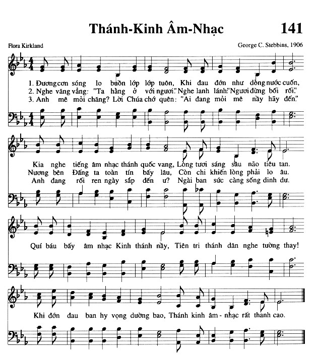 1. Đương cơn sóng lo buồn lớp lớp tuôn, Khi đau đớn như dòng nước cuốn, Kia nghe tiếng âm nhạc thánh quốc vang, Lòng tươi sáng sầu não tiêu tan. 2. Nghe văng vẳng: "Ta hằng ở với ngươi." Nghe lanh lánh: "Ngươi đừng bối rối." Nương bên Đấng ta toàn tín bấy lâu, Còn chỉ khiến lòng phải lo âu. 3. Anh mê mỏi chăng? Lời Chúa chớ quên: "Ai đang mỏi mê này hãy đến" Anh đang rối ren ngày sắp đến ư? Ngài ban sức càng sống dinh dư. Điệp khúc: Quí báu bấy âm nhạc Kinh thánh này, Tiên tri thánh dân nghe tường thay! Khi đớn đau ban hy vọng dường bao, Thánh kinh âm nhạc rất thành cao.