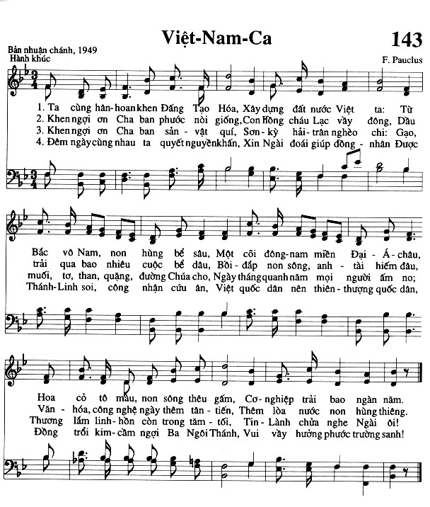 1. Ta cùng hân-hoan khen Đấng Tạo Hóa, Xây dựng đất nước Việt ta: Từ Bắc vô Nam, non hùng bể sâu, Một cõi đồng-nam miền Đại-Á-châu, Hoa cỏ tô mẫu, non sông thêu gấm, Cơ-nghiệp trải bao ngàn năm. 2. Khen ngợi ơn Cha ban phước nòi giống, Con Hồng cháu Lạc vầy đông, Dầu trải qua bao nhiêu cuộc bể dâu, Bồi-đắp non sông, anh tài hiếm đâu, Văn-hóa, công nghệ ngày thêm tân-tiến, Thêm lòa nước non hùng thiêng. 3. Khen ngợi ơn Cha ban sản-vật quí, Sơn-kỳ hải-trân nghèo chỉ: Gạo, muối, tơ, than, quặng, đường Chúa cho, Ngày tháng quanh năm mọi người ấm no; Thương lắm linh-hồn còn trong tăm-tối, Tin-Lành chửa nghe Ngài ôi! 4. Đêm ngày cùng nhau ta quyết nguyền khấn, Xin Ngài đoái giúp đồng-nhân Được Thánh-Linh soi, công nhận cứu ân, Việt quốc dân nên thiên-thượng quốc dân, Đồng trổi kim-cầm ngợi Ba Ngôi Thánh, Vui vầy hưởng phước trường sanh!