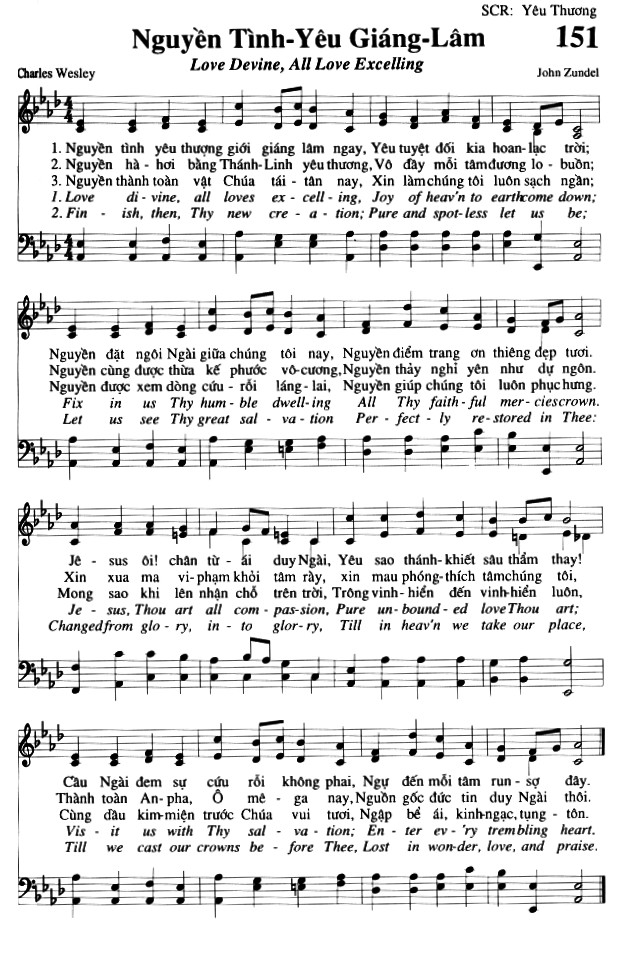 1. Nguyền tình yêu thượng giới giáng lâm ngay, Yêu tuyệt đối kia hoan lạc trời; Nguyền đặt ngôi Ngài giữa chúng tôi nay, Nguyền điểm trang ơn thiêng đẹp tươi. Je-sus ôi! chân từ ái duy Ngài, Yêu sao thánh-khiết sâu thẩm thay! Cầu Ngài đem sự cứu rỗi không phai, Ngự đến mỗi tâm run sợ đây. 2. Nguyền hà - hơi bằng Thánh Linh yêu thương, Vô đây mỗi tâm đương lo - buồn; Nguyền cùng được thừa kế phước vô cương, Nguyền thảy nghỉ yên như dự ngôn. Xin xua ma vi-phạm khỏi tâm rày, xin mau phóng-thích tâm chúng tôi, Thành toàn An-pha, Ô mê ga nay, Nguồn gốc đức tin duy Ngài thôi. 3. Nguyền thành toàn vật Chúa tái tân nay, Xin làm chúng tôi luôn sạch ngần; Nguyền được xem dòng cứu - rỗi láng-lai, Nguyền giúp chúng tôi luôn phục hưng. Mong sao khi lên nhận chỗ trên trời, Trông vinh - hiến đến vinh hiển luôn, Cùng dầu kim miện trước Chúa vui tươi, Ngập bể ái, kinh ngạc, tụng tôn.