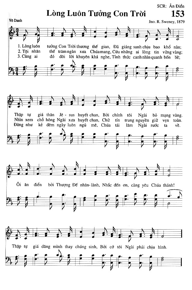 1. Lòng luôn tưởng Con Trời thương thế gian, Đã giáng sanh chịu bao khổ nàn; Thập tự giá thân Jê-sus huyết chan, Bởi chính tôi Ngài bỏ mạng vàng. 2. Tội nhân thế trăm ngàn xưa Chúamang, Cứu những ai lòng tin vững vàng; Nhìn xem chỗ hông Ngài xưa huyết chan, Chữ tín trung nguyền giữ vẹn toàn. 3. Cùng ai đó đôi lời khuyên khá nghe, Tỉnh thức canh nhìn quanh bốn bề; Đừng như kẻ đêm ngày luôn ngủ mê, Chúa tái lâm Ngài rước ta về. Điệp khúc: Ôi ân điển bởi Thượng Đế nhân-lành, Nhắc đến ơn, càng yêu Chúa thánh! Thập tự giá dâng mình thay chúng sinh, Bởi cớ tôi Ngài phải chịu hình.