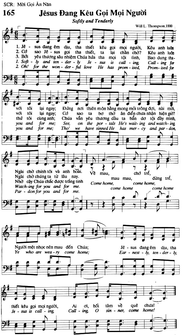 1. Jêsus đang êm dịu, tha thiết kêu gọi mọi người, Kêu anh luôn với tôi lại ngay; Ngài chờ chính tôi và anh hoài. Người mệt nhọc nên mau đến Chúa; Jêsus đang êm dịu, tha thiết kêu gọi mọi người. 2. Có sao Jêsus gọi tha thiết, ta lại chần chờ? Kêu anh luôn với tôi lại ngay; Ngài chờ chúng ta từ lâu nay. Người mệt nhọc nên mau đến Chúa; Jêsus đang êm dịu, tha thiết kêu gọi mọi người. 3. Bởi yêu thương sâu nhiệm Chúa hứa tha mọi tội tình, Bao dung tha-thứ tôi cùng anh; Nhờ cậy Chúa chắc được trắng tinh. Người mệt nhọc nên mau đến Chúa; Jêsus đang êm dịu, tha thiết kêu gọi mọi người. Điệp khúc: Đứng nơi thiên môn hằng mong mỏi trông đợi, nài mời, Về mau, mau mau, chớ trể, đừng trể, Ai ơi, hối tâm về quê chưa!