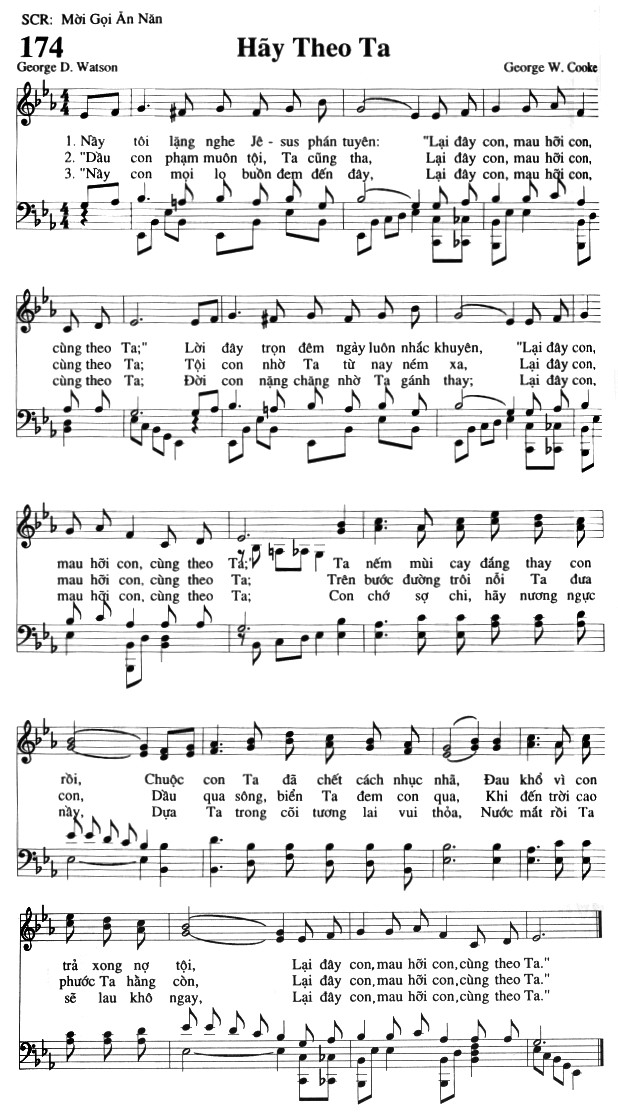 1. Nay tôi lặng nghe Jêsus phán tuyên: Lời đây trọn đêm ngày luôn nhắc khuyên, Ta nếm mùi cay đắng thay con rồi, trả xong nợ tội, 2. "Dầu con phạm muôn tội, Ta cũng tha, Tội con nhờ Ta từ nay ném xa, Trên bước đường trôi nỗi Ta đưa con, phước Ta hàng còn, 3. "Này con mọi lo buồn đem đến đây, Đời con nặng chăng nhờ Ta gánh thay; Con chớ sợ chi, hãy nương ngực này, Dựa Ta trong cõi tương lai vui thỏa, sẽ lau khô ngay, Điệp khúc: "Lại đây con, mau hỡi con, Lại đây con, mau hỡi con, Lại đây con, mau hỡi con, mau hỡi con, cùng theo Ta; Chuộc con Ta đã chết cách nhục nhã, Đau khổ vì con Dầu qua sông, biển Ta đem con qua, Khi đến trời cao Nước mắt rồi Ta Lại đây con, mau hỡi con, cùng theo Ta." Lại đây con, mau hỡi con, cùng theo Ta." Lại đây con, mau hỡi con, cùng theo Ta."