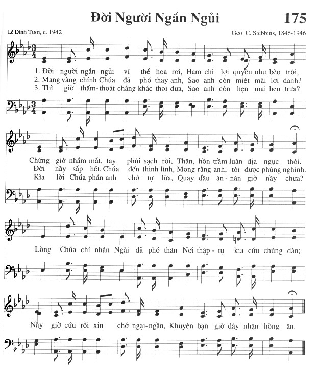 1. Đời người ngắn ngủi ví thể hoa rơi, Ham chi lợi quyền như bèo trôi, Chừng giờ nhắm mắt, tay phủi sạch rồi, Thân, hồn trầm luân địa ngục thôi. 2. Mạng vàng chính Chúa đã phó thay anh, Sao anh còn miệt-mài lợi danh? Đời nầy sắp hết, Chúa đến thình lình, Mong rằng anh, tôi được phùng nghinh. 3. Thì giờ thấm-thoát chẳng khác thoi đưa, Sao anh còn hẹn mai hẹn trưa? Kìa lời Chúa phán anh chớ tự lừa, Quay đầu ăn năn giờ này chưa? Điệp khúc: Lòng Chúa chí nhân Ngài đã phó thân Nơi thập tự kia cứu chúng dân; Này giờ cứu rỗi xin chớ ngại-ngần, Khuyên bạn giờ đây nhận hồng ân.