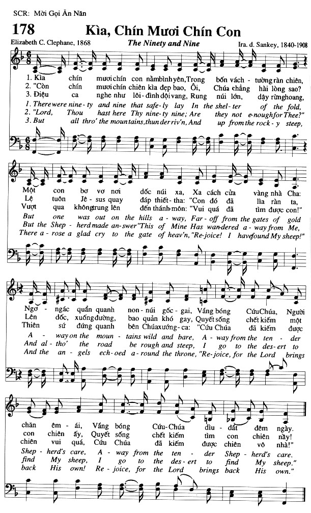 1. Kìa chín mươi chín con nằm bình yên, Trong bốn vách tường ràn chiên, Một con bơ vơ nơi dốc núi xa, Xa cách cửa vàng nhà Cha: Ngơ ngác quẩn quanh non núi gốc gai, Vắng bóng Cứu Chúa, Người chăn em ái, Vắng bóng Cứu-Chúa dìu dắt đêm ngày. 2. "Còn chín mươi chín chiên kìa đẹp bao, Ôi, Chúa chẳng hài lòng sao?" Jêsus quay đáp thiết tha: "Con đó đã lìa ràn ta, Lên dốc, xuống đường, bao quản khó gay, Quyết sống chết kiếm con chiên ấy, Quyết sống chết kiếm tìm con chiên này!" 3. Điệu ca nghe như lôi đình dội vang, Rung núi lớn, dậy rừng hoang, Vượt qua không trung lên đến thánh môn: "Vui quá đã tìm được con!" Thiên sứ đứng quanh bên Chúa xướng ca: "Cứu Chúa đã kiếm được chiên vui quá, Cứu Chúa đã kiếm được chiên vô nhà!"