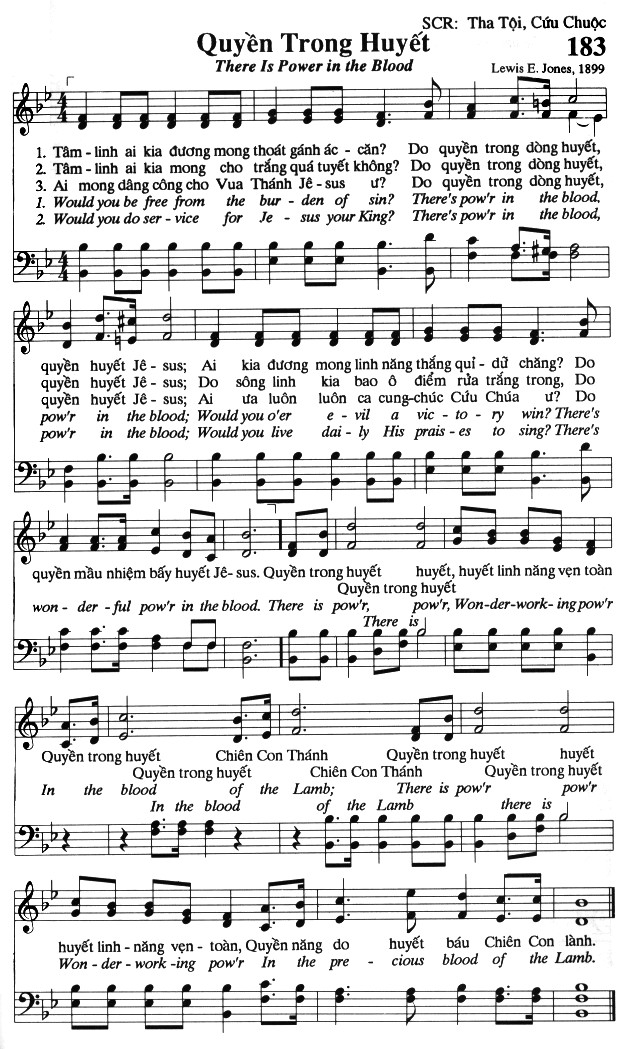 1. Tâm - linh ai kia đương mong thoát gánh ác - căn? Do quyền trong dòng huyết, quyền huyết Jê-sus; Ai kia đương mong linh năng thắng quỉ - dữ chăng? 2. Tâm - linh ai kia mong cho trắng quá tuyết không? Do quyền trong dòng huyết, quyền huyết Jê-sus; Do sông linh kia bao ô điểm rửa trắng trong? 3. Ai mong dâng công cho Vua Thánh Jê - sus ư? Do quyền trong dòng huyết, quyền huyết Jê-sus; Ai ưa luôn luôn ca cung-chúc Cứu Chúa ư? Điệp khúc: Do quyền mầu nhiệm bấy huyết Jê-sus. Quyền trong huyết huyết, huyết linh năng vẹn toàn. Quyền trong huyết Chiên Con Thánh. Quyền trong huyết huyết linh - năng vẹn - toàn, Quyền năng do huyết báu Chiên Con lành.
