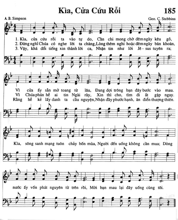 1. Kìa, cửa cứu rỗi ta vào tự do, Cần chi mong chờ đêm ngày kêu gõ, Vì cửa ấy sẵn mở toang từ lâu, Đang đợi trông bạn đây bước vào mau. 2. Đừng nghĩ Chúa có nghe lời ta chăng, Lòng thêm nghi hoặc đêm ngày băn khoăn, Vì Chúa phán hễ ai tin Ngài rày, Xin thì cho, tìm đi ắt gặp ngay. 3. Vậy, khá đổi tiếng xin thành lời ca, Nhận tin như lời Jêsus tuyên ra; Rằng hễ kẻ lấy danh ta cầu nguyện, Nhận đầy phước hạnh, ân điển thượng thiên. Điệp khúc: Kìa, sông sanh mạng tuôn chảy bốn mùa, Người đến uống không cần mua; Dòng nước ấy vốn phát nguyên từ trên rồi, Mời bạn mau lại đây uống cùng tôi.