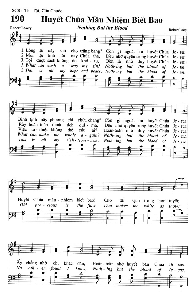1. Lòng tội nầy sao cho trắng băng? Còn gì ngoài ra huyết Chúa Jê-sus; What can wash a way my sin? Noth-ing but the blood of Je-sus; Bình tịnh này phương chỉ chữa chăng? Còn gì ngoài ra huyết Chúa Jêsus. What can make me whole a gain? Noth-ing but the blood of Jesus. 2. Mọi tội tình tôi nay Chúa tha, Đều nhờ quyền trong huyết Chúa Jê-sus; This is all my hope and peace, Noth-ing but the blood of Je-sus; Rày hoàn toàn thoát ách qui ma, Đều nhờ quyền trong huyết Chúa Jê-sus. This is all my righ-teous-ness, Noth-ing but the blood of Jesus. 3. Tội được sạch không do khổ tu, Bèn là nhờ duy huyết Chúa Jê-sus; Việc từ thiện không thể cứu ai? Hoàn toàn nhờ duy huyết Chúa Jê-sus. Ấy chẳng nhờ chỉ khác đâu, Hoàn - toàn nhờ huyết báu Chúa Jêsus. No oth - er fount I know, Noth-ing but the blood of Jesus. Điệp khúc: Huyết Chúa mầu nhiệm biết bao! Cho tôi sạch trong hơn tuyết; Oh! pre - cious is the flow That makes me white as snow;