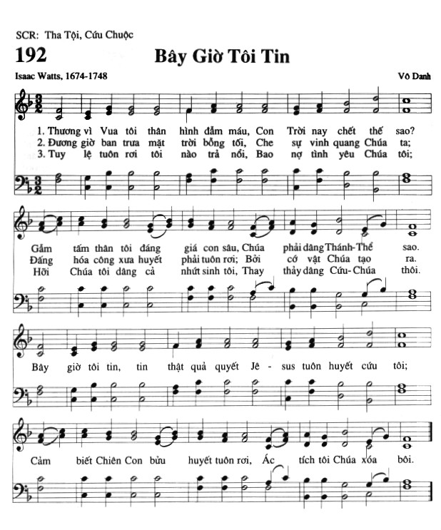 1. Thương vì Vua tôi thân hình đẫm máu, Con Trời nay chết thế sao? Gấm tấm thân tôi đáng giá con sâu, Chúa phải dâng Thánh-Thể sao. 2. Đương giờ ban trưa mặt trời bỗng tối, Che sự vinh quang Chúa ta; Đáng hóa công xua huyết phải tuôn rơi; Bởi cớ vật Chúa tạo ra. 3. Tuy lệ tuôn rơi tôi nào trả nổi, Bao nợ tình yêu Chúa tôi; Hỡi Chúa tôi dâng cả nhứt sinh tôi, Thay thảy dâng Cứu-Chúa thôi. Điệp khúc: Bây giờ tôi tin, tin thật quả quyết Jê-sus tuôn huyết cứu tôi; Cảm biết Chiên Con bửu huyết tuôn rơi, Ác tích tôi Chúa xóa bôi.