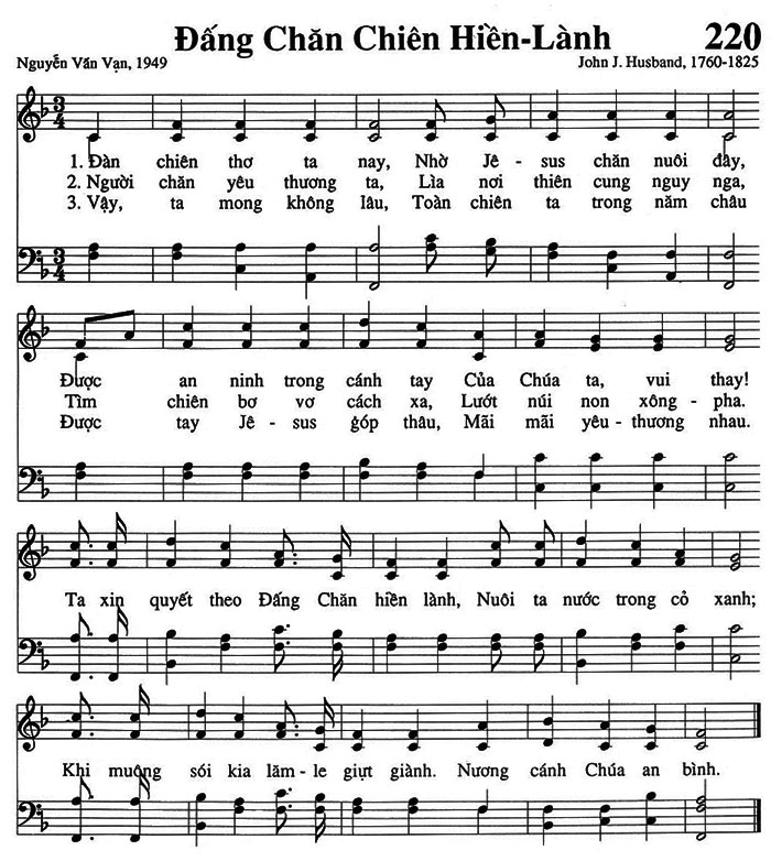 1. Đàn chiên thơ ta nay, Nhờ Je-sus chăn nuôi đây, Được an ninh trong cánh tay Của Chúa ta, vui thay! Ta xin quyết theo Đấng Chăn hiền lành, Nuôi ta nước trong cỏ xanh; Khi muông sói kia lăm le giựt giành. Nương cánh Chúa an bình. 2. Người chăn yêu thương ta, Lìa nơi thiên cung nguy nga, Tìm chiên bơ vơ cách xa, Lướt núi non xông pha. Ta xin quyết theo Đấng Chăn hiền lành, Nuôi ta nước trong cỏ xanh; Khi muông sói kia lăm le giựt giành. Nương cánh Chúa an bình. 3. Vậy, ta mong không lâu, Toàn chiên ta trong năm châu Được tay Je-sus góp thâu, Mãi mãi yêu - thương nhau. Ta xin quyết theo Đấng Chăn hiền lành, Nuôi ta nước trong cỏ xanh; Khi muông sói kia lăm le giựt giành. Nương cánh Chúa an bình.