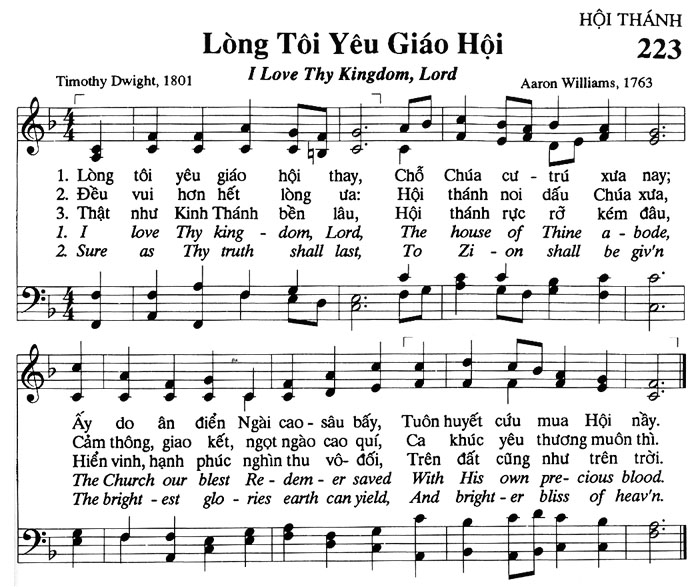 1. Lòng tôi yêu giáo hội thay, Chỗ Chúa cư trú xưa nay; Ấy do ân điển Ngài cao - sâu bấy, Tuôn huyết cứu mua Hội nầy. 2. Đều vui hơn hết lòng ưa: Hội thánh noi dấu Chúa xưa, Cảm thông, giao kết, ngọt ngào cao quí, Ca khúc yêu thương muôn thì. 3. Thật như Kinh Thánh bền lâu, Hội thánh rực rỡ kém đâu, Hiển vinh, hạnh phúc nghìn thu vô đối, Trên đất cũng như trên trời.