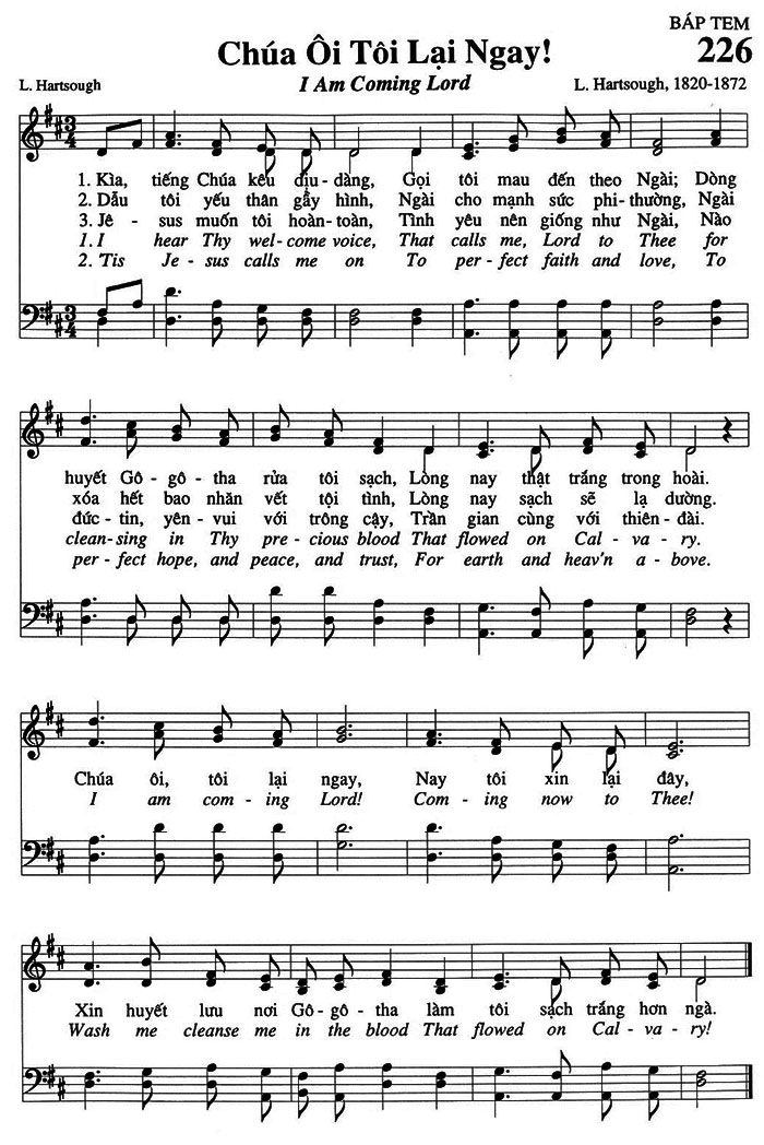 1. Kìa, tiếng Chúa kêu dịu - dàng, Gọi tôi mau đến theo Ngài; Dòng huyết Gô - gô - tha rửa tôi sạch, Lòng nay thật trắng trong hoài. 2. Dẫu tôi yếu thân gầy hình, Ngài cho mạnh sức phi - thường, Ngài xóa hết bao nhăn vết tội tình, Lòng nay sạch sẽ lạ dường. 3. Je - sus muốn tôi hoàn - toàn, Tình yêu nên giống như Ngài, Nào đức - tin, yên - vui với trông cậy, Trần gian cùng với thiên - đài. Điệp khúc: Chúa ôi, tôi lại ngay, Nay tôi xin lại đây, Xin huyết lưu nơi Gô - gô - tha làm tôi sạch trắng hơn ngà.