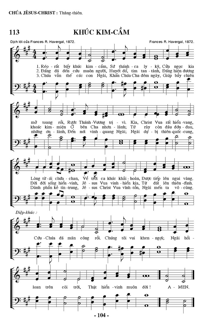 1. Réo rất bấy khúc kim cầm, Sứ thánh - ca ly kỳ, Cửa ngọc kia mở toang rồi, Rước Thánh - Vương trị vì. Lòng từ ái chứa chan, Về trời ca khúc khải - hoàn, Được tiếp lên ngai vàng. 2. Đấng đã đến cứu muôn người, Huyết đổ, tim tan tành, Đấng hiện đương khoác kim miện Ở bên Cha nhơn lành; Đời đời sống hiển vinh, Jê - sus Vua vinh hiển kia, Từ đất lên thiên đình, 3. Chúa vẫn thế các con Ngài, Khẩn Chúa Cha đêm ngày, Giúp bầy chiên những ơn lành, Đến nơi vinh - quang Ngài, Ngài dự bị thiên quốc -cung, Dành phần kẻ tín trung, Jê - sus Christ Vua vĩnh tồn, Ngài mến ta vô cùng. Điệp khúc: Cứu Chúa đã mãn công rồi. Chúng tôi vui khen ngợi; Ngài hồi loan trên cõi trời, Thật hiển vinh muôn đời! A - MEN.