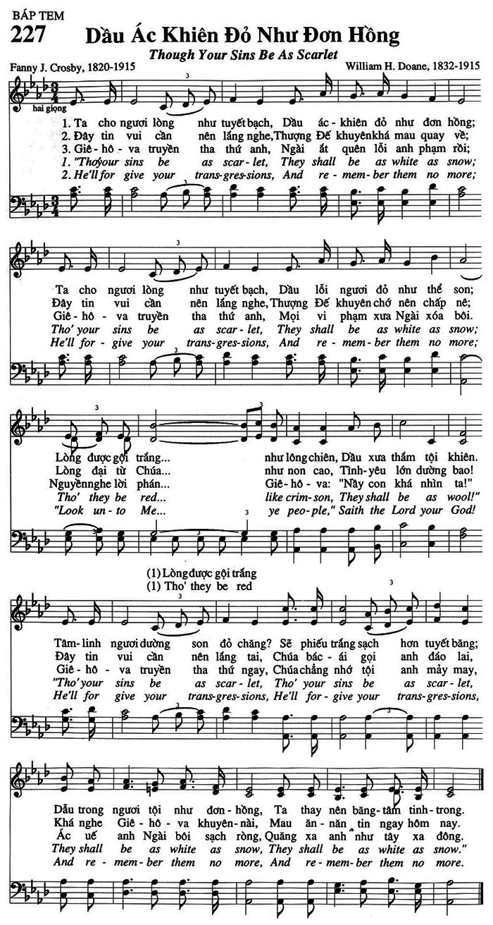 1. Ta cho ngươi lòng như tuyết bạch, Dầu ác khiên đỏ như đơn hồng; Tho' your sins be as scarlet, They shall be as white as snow; Ta cho ngươi lòng như tuyết bạch, Dầu lỗi ngươi đỏ như thể son; Tho' your sins be as scarlet, They shall be as white as snow; Tâm-linh ngươi dường son đỏ chăng? Sẽ phiếu trắng sạch hơn tuyết băng; "Tho' your sins be as scarlet, Tho' your sins be as scar - let, Dẫu trong ngươi tội như đơn - hồng, Ta thay nên băng-tâm tỉnh-trong. They shall be as white as snow, They shall be as white as snow." 2. Đây tin vui cần nên lắng nghe, Thượng Đế khuyên khá mau quay về; He'll for give your trans-gres-sions, And re-mem-ber them no more; Đây tin vui cần nên lắng nghe, Thượng Đế khuyên chớ nên chấp nê; He'll for give your trans-gres-sions, And re-mem-ber them no more; Đây tin vui cần nên lắng tai, Chúa bác ái gọi anh đáo lai, He'll for give your trans-gres-sions, He'll for give your trans-gres-sions, Khá nghe Giê-hô-va khuyên nài, Mau ăn năn tin ngay hôm nay. And re-mem-ber them no more, And re-mem-ber them no more. 3. Giê-hô-va truyền tha thứ anh, Ngài ắt quên lỗi anh phạm rồi; Giê-hô-va truyền tha thứ anh, Mọi vi phạm xưa Ngài xóa bôi. Giê-hô-va: "Này con khá nhìn ta!" Giê-hô-va truyền tha thứ ngay, Chúa chẳng nhớ tội anh mảy may, Ác uế anh Ngài bôi sạch ròng, Quăng xa anh như tây xa đông. Điệp khúc: Lòng được gội trắng như lông chiên, Dầu xưa thấm tội khiên. Lòng đại từ Chúa như non cao, Tình yêu lớn dường bao! Nguyền nghe lời phán... Tho' they be red like crim-son, They shall be as wool! "Look un-to Me... ye peo-ple," Saith the Lord your God! (1) Lòng được gội trắng (1) Tho' they be red