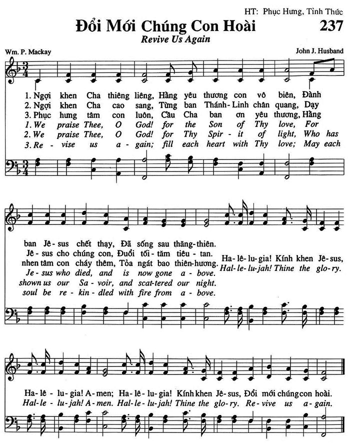 1. Ngợi khen Cha thiêng liêng, Hằng yêu thương con vô biên, Đành ban Jê-sus chết thay, Đã sống sau thăng-thiên. We praise Thee, O God! for the Son of Thy love, For Jesus who died, and is now gone a - bove. 2. Ngợi khen Cha cao sang, Từng ban Thánh-Linh chân quang, Dạy Jê-sus cho chúng con, Đuổi tối tăm tiêu tan. We praise Thee, O God! for Thy Spir - it of light, Who has shown us our Sa - voir, and scat-tered our night. 3. Phục hưng tâm con luôn, Cầu Cha ban ơn yêu thương, Hằng nhen tâm con cháy thêm, Tỏa ngát bao thiên hương. Re - vise us a - gain; fill each heart with Thy love; May each soul be re - kin - dled with fire from a - bove. Điệp khúc: Ha-lê-lu-gia! Kính khen Jê-sus, Ha-lê-lu-gia! Kính khen Jê-sus, Đổi mới chúng con hoài. Hal-le-lu-jah! A-men. Hal-le-lu-jah! Thine the glo-ry. Re- vive us a- gain.
