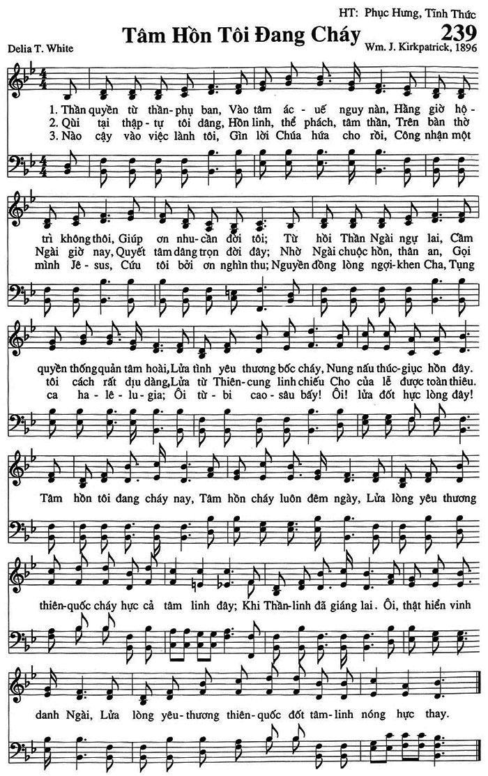 1. Thần quyền từ thần-phụ ban, Vào tâm ác - uế nguy nàn, Hằng giờ hộ - trì không thôi, Giúp ơn nhu-cần đời tôi; Từ Ngài giờ nay, Quyết tâm dâng trọn đời đây; quyền thống quản tâm hoài, Lửa tình yêu thương bốc cháy, Nung nấu thúc giục hồn đây. 2. Qùi tại thập - tự tôi dâng, Hồn linh, thể phách, tâm thần, Trên bàn thờ Ngài ngự lai, Cầm mình Jêsus, Cứu tôi bởi ơn nghìn thu; Nguyền đồng lòng ngợi khen Cha, Tụng tôi cách rất dịu dàng, Lửa từ Thiên-cung linh chiếu Cho của lễ được toàn thiêu. 3. Nào cậy vào việc lành tôi, Gìn lời Chúa hứa cho rồi, Công nhận một hồi Thần Ngài ngự lai, Cầm mình Jêsus, Cứu tôi bởi ơn nghìn thu; Nguyền đồng lòng ngợi khen Cha, Tụng ca ha - lê - lu - gia; Ôi từ - bi cao - sâu bấy! Ôi! lửa đốt hực lòng đây! Điệp khúc: Tâm hồn tôi đang cháy nay, Tâm hồn cháy luôn đêm ngày, Lửa lòng yêu thương thiên-quốc cháy hực cả tâm linh đây; Khi Thần-linh đã giáng lai. Ôi, thật hiển vinh danh Ngài, Lửa lòng yêu-thương thiên-quốc đốt tâm-linh nóng hực thay.