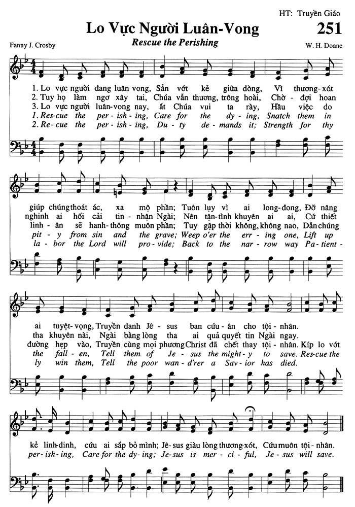 1. Lo vực người đang luân vong, Sẳn vớt kẻ giữa dòng, Vì thương xót giúp chúng thoát ác, xa mộ phần; Tuôn lụy vì ai tuyệt vọng, Truyền danh Jê-sus ban cứu-ân cho tội nhân. 2. Tuy họ làm ngơ xây tai, Chúa vẫn thương, trông hoài, Chờ đợi hoan nghinh ai hối cải tin nhận Ngài; Nên tận tình khuyên ai ai, Cứ thiết tha khuyên nài, Ngài bằng lòng tha ai quả quyết tin Ngài ngay. 3. Lo vực người luân-vong nay, ắt Chúa vui ta rày, Hầu việc do linh ân sẽ hanh thông muôn phần; Tuy gặp thời không, không nao, Dẫn chúng đường hẹp vào, Truyền cùng mọi phương Christ đã chết thay tội nhân. Điệp khúc: kẻ linh-dinh, cứu ai sắp bỏ mình; Jê-sus giàu lòng thương xót, Cứu muôn tội-nhân.
