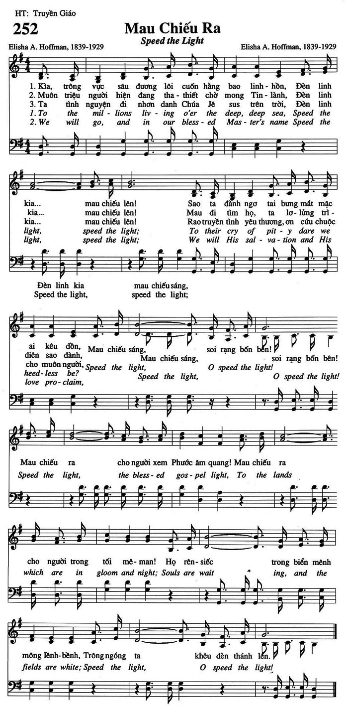 1. Kìa, trông vực sâu đương lôi cuốn hằng bao linh hồn, Đèn linh kia mau chiếu lên! Sao ta đành ngơ tai bưng mắt mặc ai kêu dồn, Mau chiếu sáng, soi rạng bốn bến! Mau chiếu ra cho người xem Phước âm quang! Mau chiếu ra cho người trong tối mê-man! Họ rên-siếc trong biển mênh mông lềnh bềnh, Trông ngóng ta khều đền thánh lớn. 2. Muôn triệu người hiện đang tha-thiết chờ mong Tin-lành, Đèn linh kia mau chiếu lên! Mau đi tìm họ, ta lơ lửng trì-diên sao đành, Mau chiếu sáng, soi rạng bốn bên! Mau chiếu ra cho người xem Phước âm quang! Mau chiếu ra cho người trong tối mê-man! Họ rên-siếc trong biển mênh mông lềnh bềnh, Trông ngóng ta khều đền thánh lớn. 3. Ta tình nguyện đi nhơn danh Chúa Jê sus trên trời, Đèn linh kia mau chiếu lên! Rao truyền tình yêu thương, ơn cứu chuộc cho muôn người, Mau chiếu sáng, soi rạng bốn bên! Mau chiếu ra cho người xem Phước âm quang! Mau chiếu ra cho người trong tối mê-man! Họ rên-siếc trong biển mênh mông lềnh bềnh, Trông ngóng ta khều đền thánh lớn. Điệp khúc: Speed the light, speed the light; To their cry of pity dare we heed-less be? Speed the light, O speed the light! Speed the light, the bless-ed gos-pel light, To the lands which are in gloom and night; Souls are wait-ing, and the fields are white; Speed the light, O speed the light!