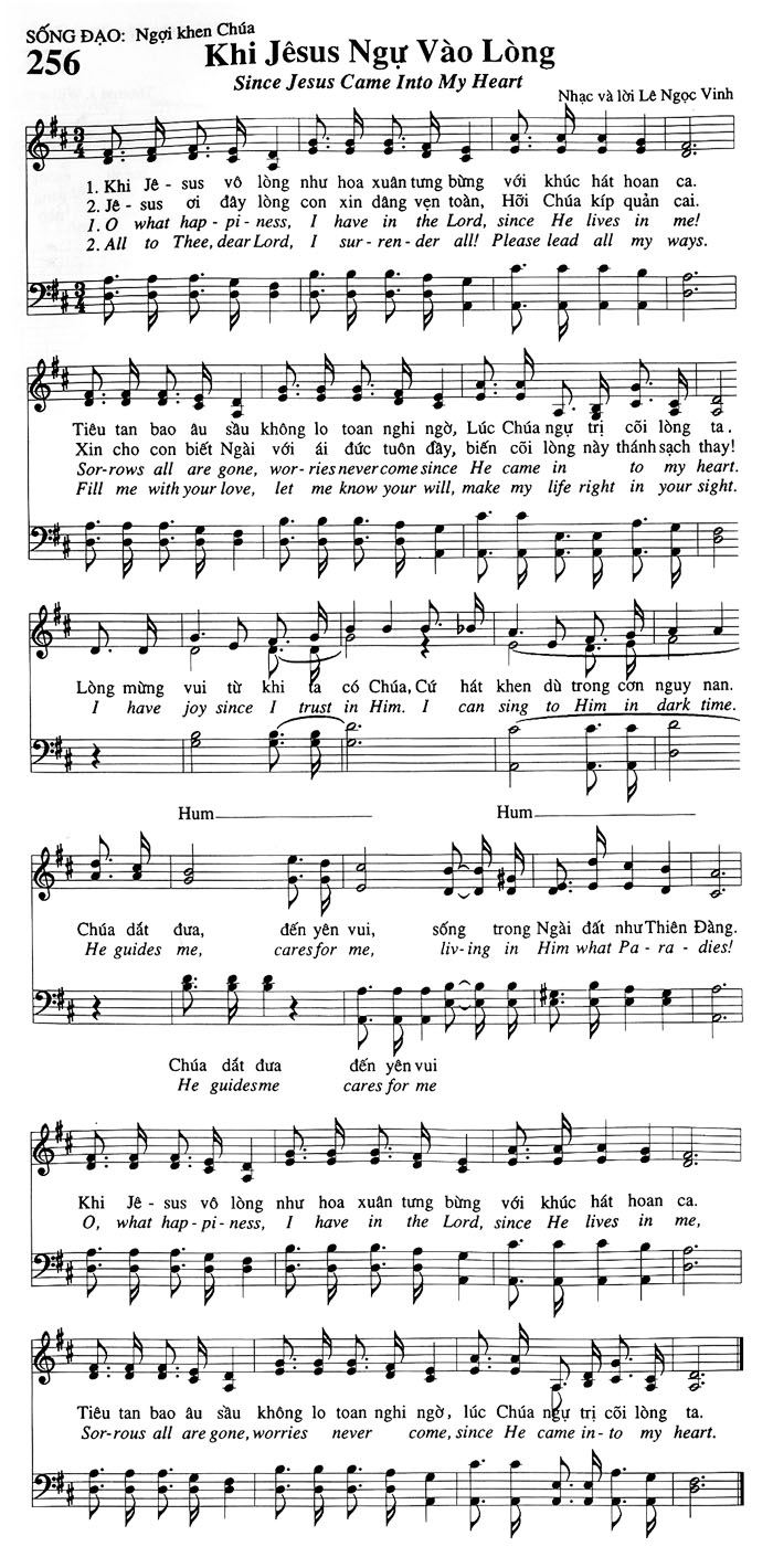 1. Khi Jêsus vô lòng như hoa xuân tưng bừng với khúc hát hoan ca. Tiêu tan bao âu sầu không lo toan nghi ngờ, Lúc Chúa ngự trị cõi lòng ta. Lòng mừng vui từ khi có Chúa, Cứ hát khen dù trong cơn nguy nan. Chúa dắt đưa, đến yên vui, sống trong Ngài đất như Thiên Đàng. Khi Jêsus vô lòng như hoa xuân tưng bừng với khúc hát hoan ca. Tiêu tan bao âu sầu không lo toan nghi ngờ, lúc Chúa ngự trị cõi lòng ta. 2. Jêsus ơi đây lòng con xin dâng vẹn toàn, Hỡi Chúa kíp quản cai. Xin cho con biết Ngài với ái đức tuôn đầy, biến cõi lòng này thánh sạch thay! Lòng mừng vui từ khi có Chúa, Cứ hát khen dù trong cơn nguy nan. Chúa dắt đưa, đến yên vui, sống trong Ngài đất như Thiên Đàng. Khi Jêsus vô lòng như hoa xuân tưng bừng với khúc hát hoan ca. Tiêu tan bao âu sầu không lo toan nghi ngờ, lúc Chúa ngự trị cõi lòng ta.