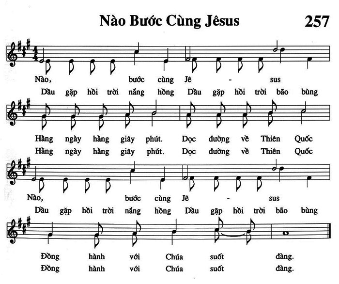 1. Nào, bước cùng Jêsus Dầu gặp hồi trời nắng hồng Dầu gặp hồi trời bão bùng Hằng ngày hằng giây phút. Dọc đường về Thiên Quốc Đồng hành với Chúa suốt đàng. 2. Nào, bước cùng Jêsus Dầu gặp hồi trời nắng hồng Dầu gặp hồi trời bão bùng Hằng ngày hằng giây phút. Dọc đường về Thiên Quốc Đồng hành với Chúa suốt đàng.