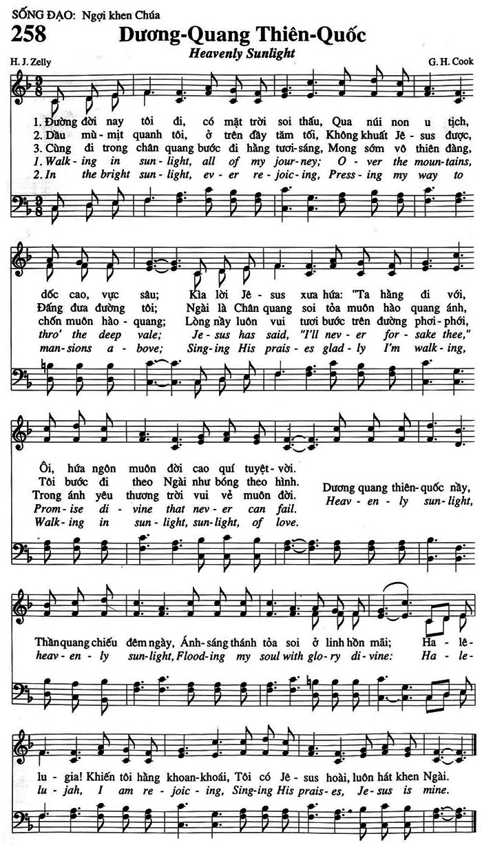 1. Đường đời nay tôi đi, có mặt trời soi thấu, Qua núi non u tịch, dốc cao, vực sâu; Kìa lời Jêsus xưa hứa: "Ta hằng đi với, Đấng đưa đường tôi; Ôi, hứa ngôn muôn đời cao quí tuyệt-vời. Thần quang chiếu đêm ngày, Ánh sáng thánh tỏa soi ở linh hồn mãi; Ha lê-lu-gia! Khiến tôi hằng khoan-khoái, Tôi có Jêsus hoài, luôn hát khen Ngài. 2. Dầu mù - mịt quanh tôi, ở trên đầy tăm tối, Không khuất Jêsus được, Ngài là Chân quang soi tỏa muôn hào quang ánh, chốn muôn hào quang; Tôi bước đi theo Ngài như bóng theo hình. Ha lê-lu-gia! Khiến tôi hằng khoan-khoái, Tôi có Jêsus hoài, luôn hát khen Ngài. 3. Cùng đi trong chân quang bước đi hằng tươi sáng, Mong sớm vô thiên đàng, Lòng này luôn vui tươi bước trên đường phơi-phới, Trong ánh yêu thương trời vui vẻ muôn đời. Dương quang thiên-quốc này, Ha lê-lu-gia! Khiến tôi hằng khoan-khoái, Tôi có Jêsus hoài, luôn hát khen Ngài.