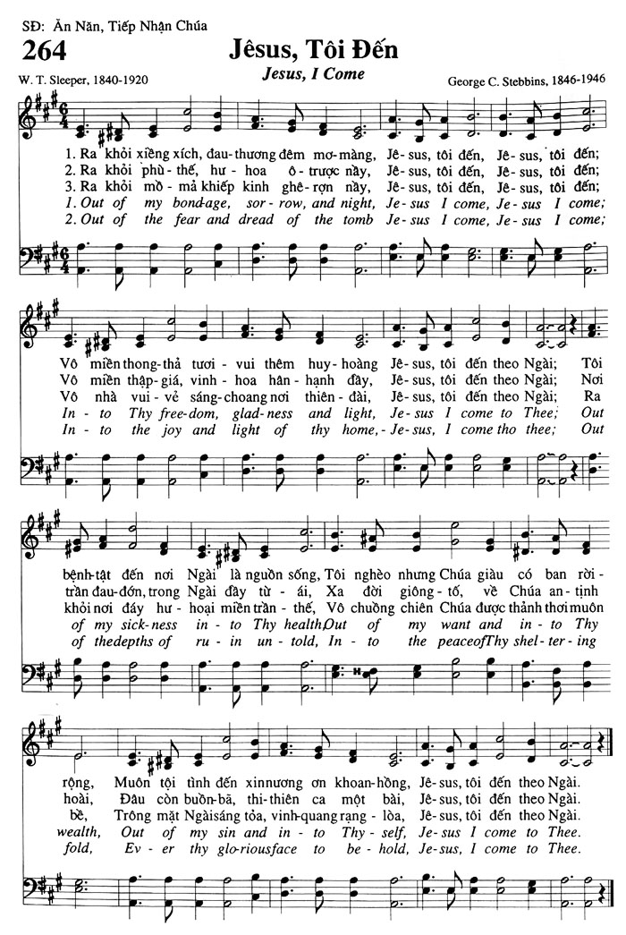 1. Ra khỏi xiềng xích, đau thương đêm mơ màng, Jê-sus, tôi đến, Jê-sus, tôi đến; Vô miền thong-thả tươi vui thêm huy-hoàng Jê-sus, tôi đến theo Ngài; Tôi bệnh tật đến nơi Ngài là nguồn sống, Tôi nghèo nhưng Chúa giàu có ban rời-rộng, Muôn tội tình đến xinnương ơn khoan-hồng, Jê-sus, tôi đến theo Ngài. 2. Ra khỏi phù thế, hư hoa ô - trược nầy, Jê-sus, tôi đến, Jê-sus, tôi đến; Vô miền thập-giá, vinh hoa hân hạnh đây, Jê-sus, tôi đến theo Ngài; Nơi trần đau đớn, trong Ngài đây từ - ái, Xa đời giông-tố, về Chúa an-tịnh hoài, Đâu còn buồn bã, thi-thiên ca một bài, Jê-sus, tôi đến theo Ngài. 3. Ra khỏi mồ mả khiếp kinh ghê rợn nầy, Jê-sus, tôi đến, Jê-sus, tôi đến; Vô nhà vui vẻ sáng choang nơi thiên - đài, Jê-sus, tôi đến theo Ngài; Ra khỏi nơi đáy hư - hoại miền trần - thế, Vô chuồng chiên Chúa được thảnh thơi muôn bè, Trông mặt Ngài sáng tỏa, vinh quang rạng lòa, Jê-sus, tôi đến theo Ngài.