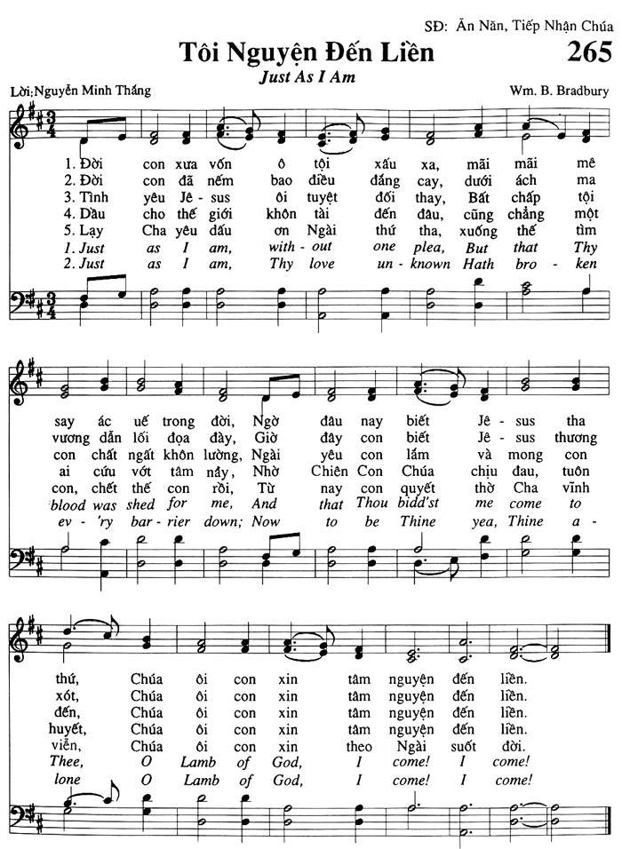 1. Đời con xưa vốn ô tội xấu xa, mãi mãi mê say ác uế trong đời, Ngờ đâu nay biết Jêsus tha thứ, Chúa ôi con xin tâm nguyện đến liền. Just as I am, with-out one plea, But that Thy blood was shed for me, And that Thou bidd'st me come to Thee, O Lamb of God, I come! I come! 2. Đời con đã nếm bao điều đắng cay, dưới ách ma vương dẫn lối đọa đày, Giờ đây con biết Jêsus thương xót, Chúa ôi con xin tâm nguyện đến liền. Just as I am, Thy love un-known Hath bro-ken ev-'ry bar-rier down; Now to be Thine yea, Thine a-lone O Lamb of God, I come! I come! 3. Tình yêu Jêsus ôi tuyệt đối thay, Bất chấp tội con chất ngất khôn lường, Ngài yêu con lắm và mong con đến, Chúa ôi con xin tâm nguyện đến liền. 4. Dầu cho thế giới khôn tài đến đâu, cũng chẳng một ai cứu vớt tâm nầy, Nhờ Chiên Con Chúa chịu đau, tuôn huyết, Chúa ôi con xin tâm nguyện đến liền. 5. Lạy Cha yêu dấu ơn Ngài thứ tha, xuống thế tìm con, chết thế con rồi, Từ nay con quyết thờ Cha vĩnh viễn, Chúa ôi con xin theo Ngài suốt đời.