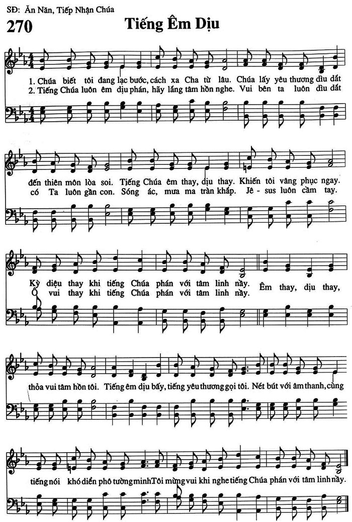 1. Chúa biết tôi đang lạc bước, cách xa Cha từ lâu. Chúa lấy yêu thương dìu dắt đến thiên môn lòa soi. Tiếng Chúa êm thay, dịu thay. Khiến tôi vâng phục ngay. Kỳ diệu thay khi tiếng Chúa phán với tâm linh này. Êm thay, dịu thay, thỏa vui tâm hồn tôi. Tiếng êm dịu bấy, tiếng yêu thương gọi tôi. Nét bút với âm thanh, cùng tiếng nói khó diễn phô tường minh Tôi mừng vui khi nghe tiếng Chúa phán với tâm linh nầy. 2. Tiếng Chúa luôn êm dịu phán, hãy lắng tâm hồn nghe. Vui bên ta luôn dìu dắt có Ta luôn gần con. Sóng ác, mưa ma tràn khắp. Jê - sus luôn cầm tay. vui thay khi tiếng Chúa phán với tâm linh này.