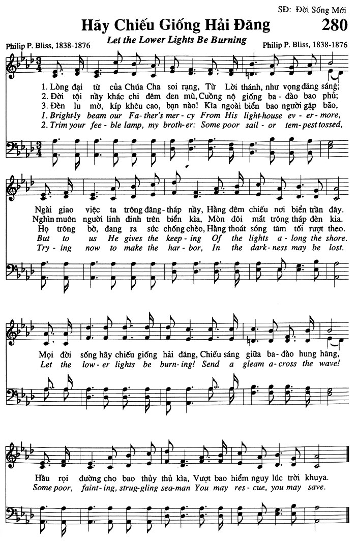 1. Lòng đại từ của Chúa Cha soi rạng, Từ Lời thánh, như vọng đăng sáng; Ngài giao việc ta trông đăng-tháp này, Hằng đêm chiếu nơi biển trần đây. Brightly beam our Father's mercy From His light-house evermore, But to us He gives the keeping Of the lights along the shore. 2. Đời tội này khác chi đêm đen mù, Cuồng nộ giống ba-đào bao phủ; Nghìn muôn người linh đinh trên biển kìa, Mòn đôi mắt trông tháp đèn kia. Trim your feeble lamp, my broth-er: Some poor sail-or tem-pest tossed, Trying now to make the har-bor, In the dark-ness may be lost. 3. Đèn lu mờ, kíp khêu cao, bạn nào! Kìa ngoài biển bao người gặp bão, Họ trông bờ, đang ra sức chống chèo, Hằng thoát sóng tăm tối rượt theo. Hầu rọi đường cho bao thủy thủ kìa, Vượt bao hiểm nguy lúc trời khuya. Some poor, faint-ing, strug-gling sea-man You may res-cue, you may save. Điệp khúc: Mọi đời sống hãy chiếu giống hải đăng, Chiếu sáng giữa ba-đào hung hăng, Let the lower lights be burn-ing! Send a gleam a-cross the wave!