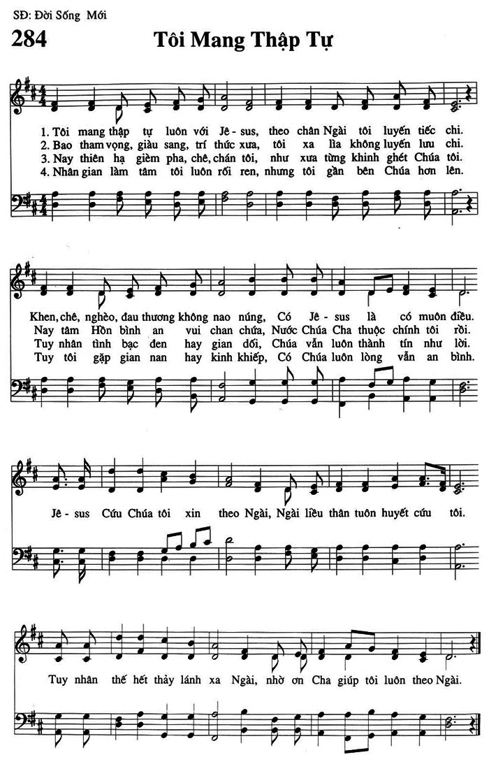 1. Tôi mang thập tự luôn với Jê-sus, theo chân Ngài tôi luyến tiếc chi. Khen, chê, nghèo, đau thương không nao núng, Có Jê-sus là có muôn điều. Jê-sus Cứu Chúa tôi xin theo Ngài, Ngài liều thân tuôn huyết cứu tôi. 2. Bao tham vọng, giàu sang, trí thức xưa, tôi xa lìa không luyến lưu chi. Nay tâm Hồn bình an vui chan chứa, Nước Chúa Cha thuộc chính tôi rồi. Tuy nhân thế hết thảy lánh xa Ngài, nhờ ơn Cha giúp tôi luôn theo Ngài. 3. Nay thiên hạ gièm pha, chê, chán tôi, như xưa từng khinh ghét Chúa tôi. Tuy nhân tình bạc đen hay gian dối, Chúa vẫn luôn thành tín như lời. 4. Nhân gian làm tâm tôi luôn rối ren, nhưng tôi gần bên Chúa hơn lên. Tuy tôi gặp gian nan hay kinh khiếp, Có Chúa luôn lòng vẫn an bình.