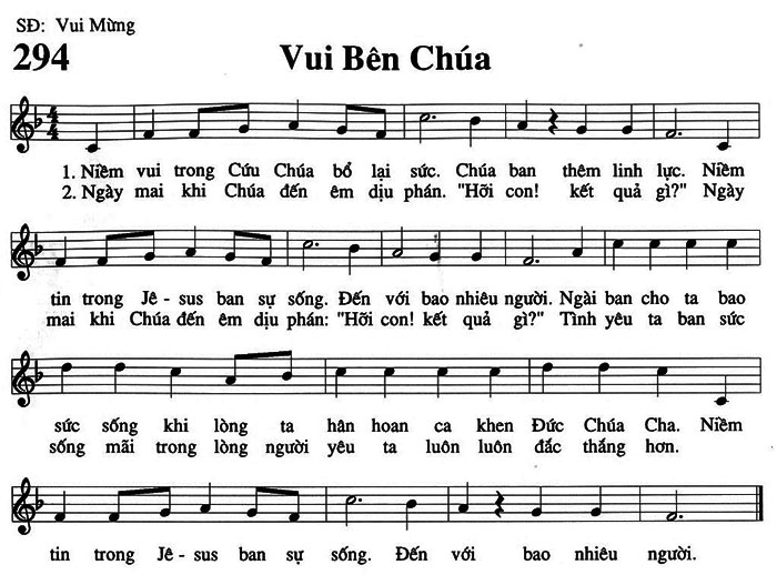 1. Niềm vui trong Cứu Chúa bổ lại sức. Chúa ban thêm linh lực. Niềm tin trong Jê-sus ban sự sống. Đến với bao nhiêu người. Ngài ban cho ta bao sức sống khi lòng ta hân hoan ca khen Đức Chúa Cha. Niềm tin trong Jê-sus ban sự sống. Đến với bao nhiêu người. 2. Ngày mai khi Chúa đến êm dịu phán. "Hỡi con! kết quả gì?" Ngày mai khi Chúa đến êm dịu phán: "Hỡi con! kết quả gì?" Tình yêu ta ban sức sống mãi trong lòng người yêu ta luôn luôn đắc thắng hơn.