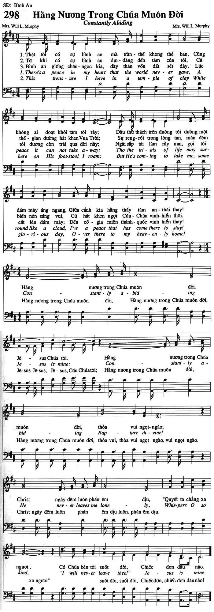 1. Thật tôi có sự bình an mà trần thế không thể ban, Cũng không ai đoạt khỏi tâm tôi rày; Dầu thử thách trên đường tôi dường một đám mây áng ngang, Giữa cảnh kia hằng thấy tâm an thái thay! Christ ngày đêm luôn phán êm dịu, "Quyết ta chẳng xa ngươi". Có Chúa bên tôi suốt đời, Chiếc đơn đầu nào. 2. Từ khi có sự bình an dịu dàng đến tâm của tôi, Cả thế gian dường hát khen Vua Trời; Sự reng-rối trong lòng tan, màn đêm biến nên sáng vui, Cứ hát khen ngợi Cứu Chúa vinh hiển thôi. He never leaves me lonely, Whispers O so kind, "I will never leave thee!" Jesus is mine. 3. Bình an giống châu ngọc kia, đầy thân vốn đất sét đây, Lúc tôi đương còn trải qua đời này; Ngài sắp tái lâm rày mai, gọi tôi cất lên đám mây; Đến cố gia miền thánh quốc vinh hiển thay! Christ ngày đêm luôn phán êm dịu luôn, phán êm dịu, xa ngươi" suốt đời, suốt đời, Chiếc đơn, chiếc đơn đâu nào! Điệp khúc: Hằng nương trong Chúa muôn đời, Hằng nương trong Chúa muôn đời, Jesus Chúa tôi. Hằng nương trong Chúa muôn đời, thỏa vui ngọt ngào; Hằng nương trong Chúa muôn đời, thỏa vui, thỏa vui ngọt ngào, vui ngọt ngào.