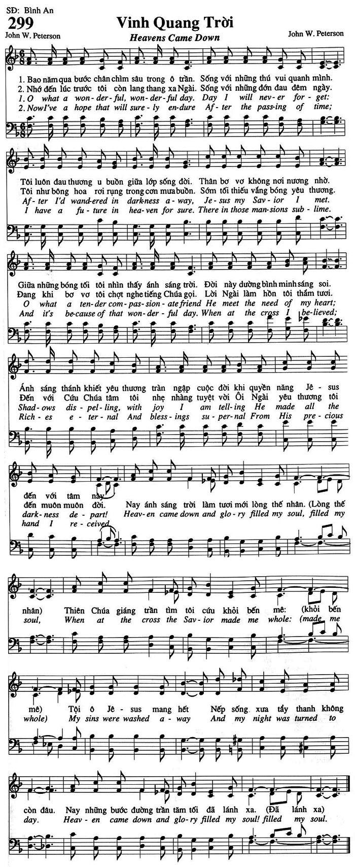 1. Bao năm qua bước chân chìm sâu trong ô trần. Sống với những thú vui quanh mình. Tôi luôn đau thương u buồn giữa lớp sống đời. Thân bơ vơ không nơi nương nhờ. Giữa những bóng tối tôi nhìn thấy ánh sáng trời. Đời này dường bình minh sáng soi. Ánh sáng thánh khiết yêu thương tràn ngập cuộc đời khi quyền năng Je-sus đến với tâm nay Thiên Chúa giáng trần tìm tôi cứu khỏi bến mê: (khỏi bến Tội ô Je-sus mang hết Nếp sống xưa tẩy thanh không còn đâu. 2. Nhớ đến lúc trước tôi còn lang thang xa Ngài. Sống với những đớn đau đêm ngày. Tôi như bông hoa rơi rụng trong cơn mưa buồn. Sớm tối thiếu vắng bóng yêu thương. Đang khi bơ vơ tôi chợt nghe tiếng Chúa gọi. Lời Ngài làm hồn tôi thắm tươi. Đến với Cứu Chúa tâm tôi nhẹ nhàng tuyệt vời Ôi Ngài yêu thương tôi đến muôn muôn đời. Thiên Chúa giáng trần tìm tôi cứu khỏi bến mê: (khỏi bến Tội ô Je-sus mang hết Nếp sống xưa tẩy thanh không còn đâu. Điệp khúc: Nay ánh sáng trời làm tươi mới lòng thế nhân. (Lòng thế Nay những bước đường trần tăm tối đã lánh xa. (Đã lánh xa) Nay ánh sáng trời làm tươi mới lòng thế nhân. (Lòng thế Nay những bước đường trần tăm tối đã lánh xa. (Đã lánh xa)