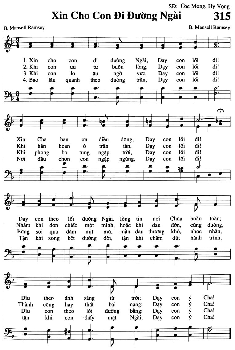 1. Xin cho con đi đường Ngài, Dạy con lối đi! Xin Cha ban ơn điều động, Dạy con lối đi! Dạy con theo lối đường Ngài, lòng tin nơi Chúa hoàn toàn; Dìu theo ánh sáng từ trời: Dạy con ý Cha! 2. Khi con ưu tư buồn lòng, Dạy con lối đi! Khi hân hoan ở trần tàn, Dạy con lối đi! Nhằm khi đơn chiếc một mình, hoặc khi đau đớn, cùng đường, Thành công hay thất bại nặng; Dạy con ý Cha! 3. Khi con lo âu ngờ vực, Dạy con lối đi! Khi phong ba tung ngập trời, Dạy con lối đi! Bừng soi qua đám mịt mù, màn đau thương khó, nhọc nhằn, Dìu con theo lối đường bằng; Dạy con ý Cha! 4. Bao lâu quanh theo đường trần, Dạy con lối đi! Nơi đâu chơn con ngập ngừng, Dạy con lối đi! Tận khi xong hết đường đời, tận khi chấm dứt hành trình, tận khi con thấy mặt Ngài, Dạy con ý Cha!