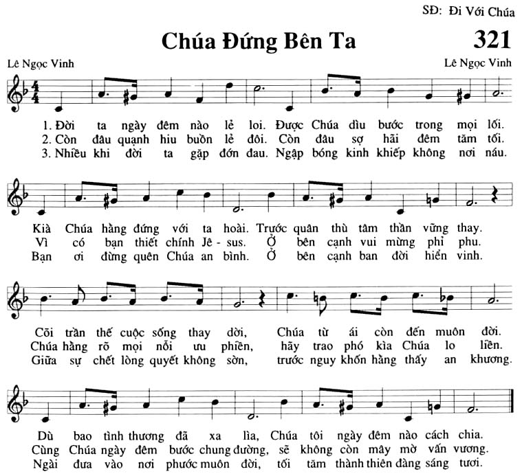 1. Đời ta ngày đêm nào lẻ loi. Được Chúa dìu bước trong mọi lối. Kià Chúa hằng đứng với ta hoài. Trước quân thù tâm thần vững thay. Cõi trần thế cuộc sống thay dời, Chúa từ ái còn đến muôn đời. Dù bao tình thương đã xa lìa, Chúa tôi ngày đêm nào cách chia. 2. Còn đâu quạnh hiu buồn lẻ đôi. Còn đâu sợ hãi đêm tăm tối. Vì có bạn thiết chính Jê-sus. Ở bên cạnh vui mừng phỉ phu. Chúa hằng rõ mọi nỗi ưu phiền, hãy trao phó kìa Chúa lo liền. Cùng Chúa ngày đêm bước chung đường, sẽ không còn mây mờ vấn vương. 3. Nhiều khi đời ta gặp đớn đau. Ngập bóng kinh khiếp không nơi náu. Bạn ơi đừng quên Chúa an bình. Ở bên cạnh ban đời hiển vinh. Giữa sự chết lòng quyết không sờn, trước nguy khốn hằng thấy an khương. Ngài đưa vào nơi phước muôn đời, tới tâm thành thiên đàng sáng tươi. Điệp khúc: Kià Chúa hằng đứng với ta hoài. Trước quân thù tâm thần vững thay. Vì có bạn thiết chính Jê-sus. Ở bên cạnh vui mừng phỉ phu. Bạn ơi đừng quên Chúa an bình. Ở bên cạnh ban đời hiển vinh.