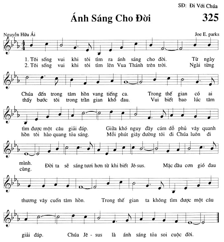 1. Tôi sống vui khi tôi tìm ra ánh sáng cho đời. Từ ngày Chúa đến trong tâm hồn vang tiếng ca. Trong thế gian có ai tìm được một câu giải đáp. Giữa khó nguy đầy cám dỗ phủ vây quanh mình. Đời ta sẽ sáng tươi hơn từ khi biết Jê-sus. Mặc dầu cơn gió đau thương vây cuốn tâm hồn. Trong thế gian ta không tìm được một câu giải đáp. 2. Tôi sống vui khi tôi tìm lên Vua Thánh trên trời. Ngài từng thấy bước tôi trong trần gian khổ đau. Vui biết bao lúc tâm hồn tôi hào quang tỏa sáng. Mỗi phút giây đường tôi đi Chúa luôn đi cùng. Đời ta sẽ sáng tươi hơn từ khi biết Jê-sus. Mặc dầu cơn gió đau thương vây cuốn tâm hồn. Trong thế gian ta không tìm được một câu giải đáp. Điệp khúc: Chúa Jê-sus là ánh sáng tỏa soi cuộc đời.