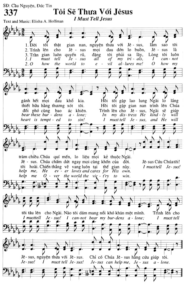 1. Đời tôi thật gian nan, nguyện thưa với Jêsus, lắm sao tôi gánh hết mọi đau khổ kia. Hồi tôi gặp lao lung Ngài lo lắng trăm chiều. Chúa quí mến, lo liệu mọi kẻ thuộc Ngài. tôi tâu lên cho Ngài. Nào tôi dám mang nổi khó khăn một mình. 2. Trình lên cho Jêsus mọi đau đớn lo buồn, Jêsus là thiết hữu hàng thương xót tôi. Hồi tôi gặp gian nan trình lên Chúa Jêsus. Chúa chấm dứt ngay mọi cùng khốn của đời. Jê-sus Cứu Chúatôi! Trình lên cho Jêsus, nguyện thưa với Jêsus. 3. Trần gian luôn quyến rũ, đặng tôi phải sa lầy, Lòng tôi luôn đối phó cùng bao ác khiên. Trình lên cho Jêsus, Ngài sẽ giúp tôi hoài. Chiến thắng về vang luôn tại thế gian này. Chỉ có Chúa Jêsus hằng cứu giúp tôi.