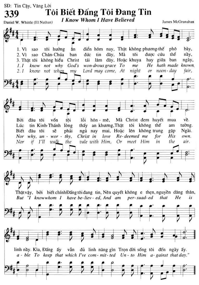 1. Vì sao tôi hưởng ân điển hôm nay, Thật không phương-thế phô bày, Bởi đâu tôi vốn tội lỗi hôn mê, Mà Christ đem huyết mua về. 2. Vì sao Chân-Chúa ban đức tin đây, Mà tôi được cứu thể này, Lúc tin Kinh-Thánh lòng thấy an khương, Thật tôi không thể am tường. 3. Thật tôi không hiểu Christ tái lâm đây, Hoặc khuya hay giữa ban ngày, Biết đâu tôi sẽ phải ngủ nay mai, Hoặc lên không trung gặp Ngài. Điệp khúc: Thật vậy, bởi biết chính Đấng tôi đang tin, Nên quyết không e thẹn, nguyền dâng thân, linh nầy. Kìa, Đấng ấy vẫn đủ linh năng gìn Trọn đời sống tôi đến ngày ấy.