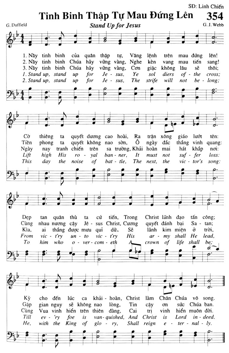 1. Nay tinh binh của quân thập tự, Vâng lệnh trên mau đứng lên! Cờ thiêng ta quyết dương cao hoài, Ra trận xông giáo lướt tên: Dẹp tan quân thù ta cứ tiến, Trong Christ lãnh đạo tấn công; Kỳ cho đến lúc ca khải hoàn, Christ làm Chân Chúa vô song. 2. Nay tinh binh Chúa hãy vững vàng, Nghe kèn vang mau tiến sang! Tiền phong ta quyết không nao sờn, Ô ngày đắc thắng vinh quang: Cùng nhau nương cậy Jêsus Christ, Cương quyết đánh bại Sa-tan; Gặp gian nguy sẽ không nao lòng, Tin cậy ơn sức Chúa ban. 3. Nay tinh binh Chúa hãy vững vàng, Cơn giặc không lâu sẽ thôi; Ngày nay tranh chiến trên sa trường, Khải hoàn mai hát khắp nơi: Kìa, ai thắng được mưu qui dữ, Sẽ lãnh kim miện ở trời, Cùng Vua vinh hiển trên thiên đàng, Cai trị vinh hiển muôn đời.