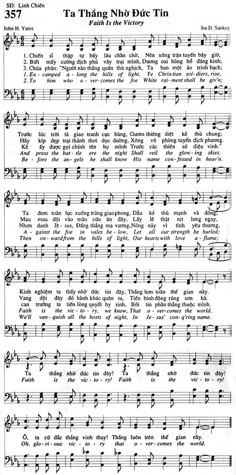 1. Chiến sĩ thập tự bấy lâu chần chờ, Nên xông trận tuyến bây giờ, Trước lúc trời tà giao tranh cực hùng, Gươm thiêng diệt kẻ thù chung; Ta đem toàn lực xuống trũng giao phong, Dẫu kẻ thù mạnh và đông, Kinh nghiệm ta thấy nhờ đức tin đây, Thắng hơn toàn thế gian này. 2. Biết mấy cường địch phủ vây trại mình, Dương oai hùng hổ đáng kinh; Hãy kíp dẹp trại thảnh thơi dọc đường, Xông vô phòng tuyến địch phương. Mau mau đội vào mão cứu ân đây, Lấy lẽ thật nịt lưng ngay, Vang dội đây đó hành khúc quân ta, Tiến binh động rúng sơn hà. 3. Chúa phán: "Người nào thắng quân thù nghịch, Ta ban một áo trinh bạch; Kẻ ấy được gọi chính tên họ mình Trước các thiên sứ diệu vinh." Nhơn danh Jêsus, Đấng thắng ma vương, Nóng nảy vì tình yêu thương, can trường ta tiến lòng quyết hy sinh, Bởi tin phần thắng thuộc mình. Điệp khúc: Ta thắng nhờ đức tin đây! Ta thắng nhờ đức tin đây! Ô, ta cứ đắc thắng vinh thay! Thắng luôn trên thế gian này.