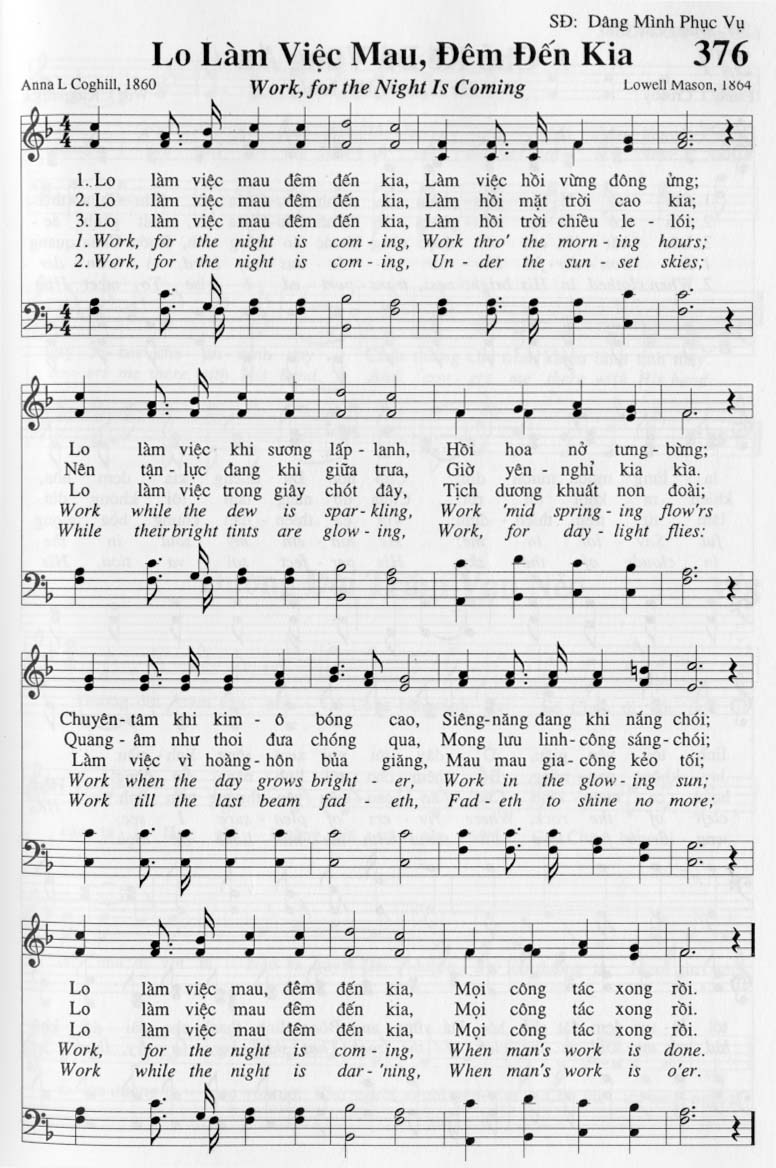 1. Lo làm việc mau đêm đến kia, Làm việc hồi vùng đông ửng; Lo làm việc khi sương lấp lanh, Hồi hoa nở tưng - bừng; Chuyên - tâm khi kim - ô bóng cao, Siêng năng đang khi nắng chói; Lo làm việc mau, đêm đến kia, Mọi công tác xong rồi. 2. Lo làm việc mau đêm đến kia, Làm hồi mặt trời cao kia; Nên tận - lực đang khi giữa trưa, Giờ yên nghỉ kia kìa. Quang - âm như thoi đưa chóng qua, Mong lưu linh công sáng- chói; Lo làm việc mau đêm đến kia, Mọi công tác xong rồi. 3. Lo làm việc mau đêm đến kia, Làm hồi trời chiều le lói; Lo làm việc trong giây chót đây, Tịch dương khuất non đoài; Làm việc vì hoàng hôn bủa giăng, Mau mau gia công kẻo tối; Lo làm việc mau đêm đến kia, Mọi công tác xong rồi.
